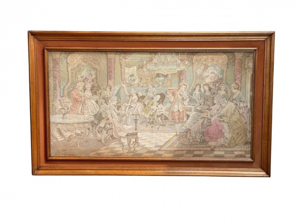 • Tapeçaria industrial, decorado ao estilo Gobelins representando cena em jardim com personagens com belo trajes de época. 68 x 131 cm. Peça com moldura.