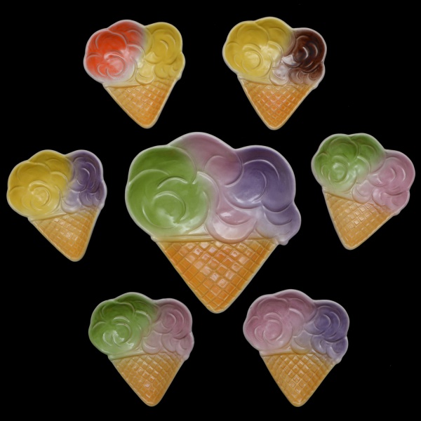 • Gracioso conjunto para sorvete composto por travessa principal e seis pratinhos de servir. Executado em cerâmica moldada e policromada. Itália. 27 x 24 cm e 18 x 17 cm.