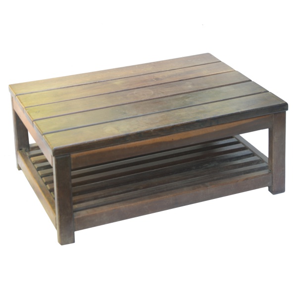 • Mesa baixa construída em ripas de madeira nobre. Tampo retangular, apoiado nas quinas em pernas retilíneas de secção quadrangular, sustentando na base plateau de mesma construção. 33 x 81 x 51 cm.