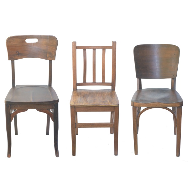 • Conjunto de 3 cadeiras diversas em madeira, sendo 2 com encostos arqueados, a outra com hastes retas. Assentos abaulados, apoiados em saias sobre pernas lisas. 80 x 40 x 38 cm / 85 x 37 x 40 cm e 83 x 37 x 37 cm.