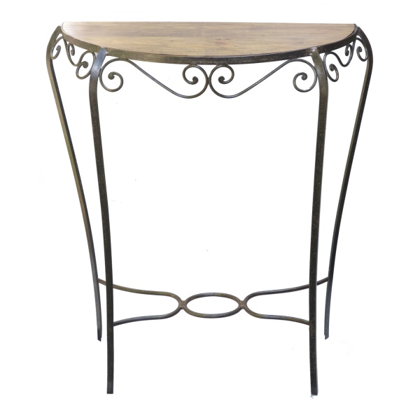 • Console com tampo em mármore recortado em meia lua, apoiado em estrutura em fer forgé. Saia ornamentada por hastes no formato de finas volutas, apoiada em pernas recurvas e lisas, reunidas à base por hastes arqueados centralizando adorno ovalado. 102 x 84 x 30 cm.