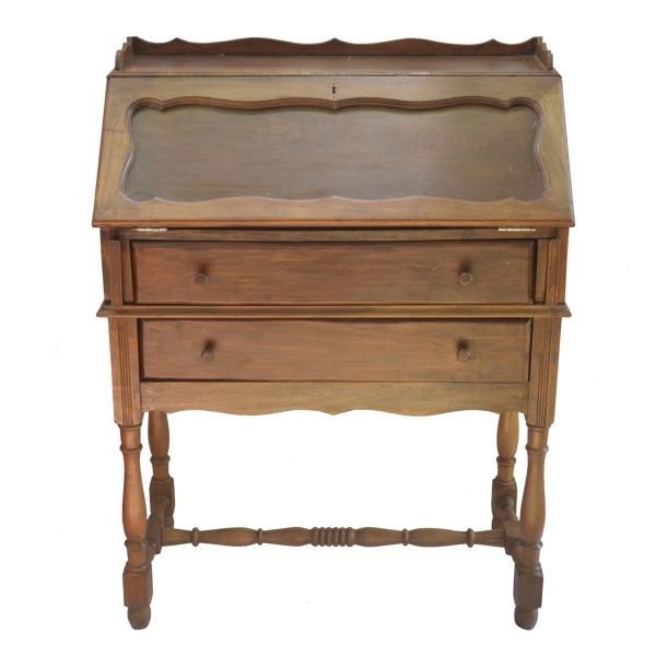 • Pequena Secretaire a abattant em madeira clara, encimada por galeria. Tampo retangular escavado com reserva ondulada, revelando interior com 3 gavetinhas e compartimento. Caixa reta apresentando frente com par de gavetões superpostos. Pernas torneadas e retilíneas, ornadas por anelados e carreteis. Base com amarração em H. 107 x 81 x 41 cm (fechado). 107 x 81 x 70 cm.