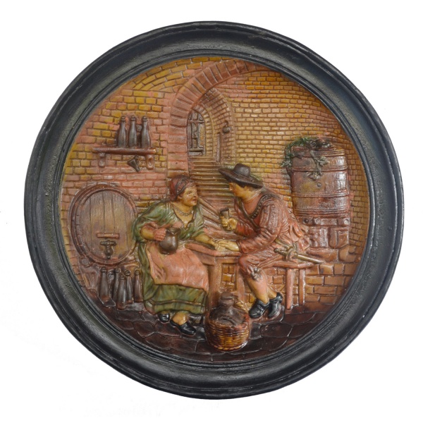 • Medalhão, possivelmente holandês, em cerâmica moldada em alto relvo e esmaltada, ornamentando por cena de taberna com casal. Borda e fundo de cor chumbo. 34 cm.