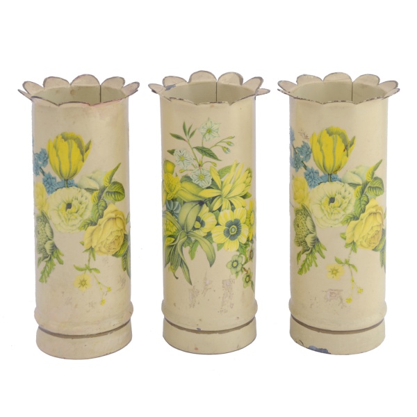 • Conjunto com três vasos cilíndricos pintado em folha de flandres. 16 x 7 cm.