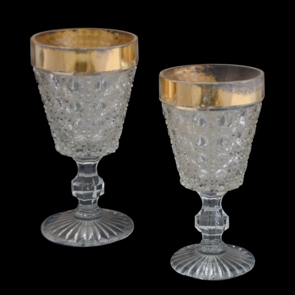 • Par de taças em vidro translucido decorado no estilo bico de jaca: Borda dourada 14 cm.