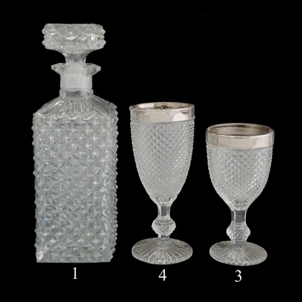 • Conjunto de Licoreiro em cristal, translucido de formato quadrangular chanfrado e lapidado. 22 x 9 cm. Acompanham 7 taças em vidro translucido decorado no estilo bico de jaca: Borda prateada.  16 cm (4 taças). 14 cm (3 taças).