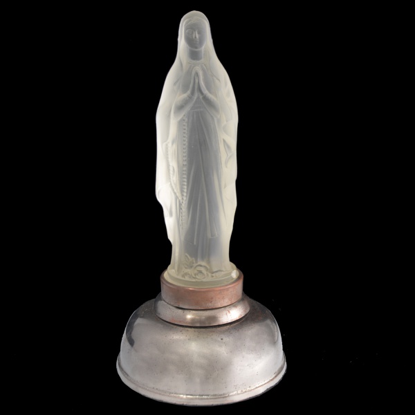 • Luminária de mesa em cristal representando a figura de Nossa Sra.. 28 cm (MT). 20 cm (imagem). 8 x 14 cm (base).