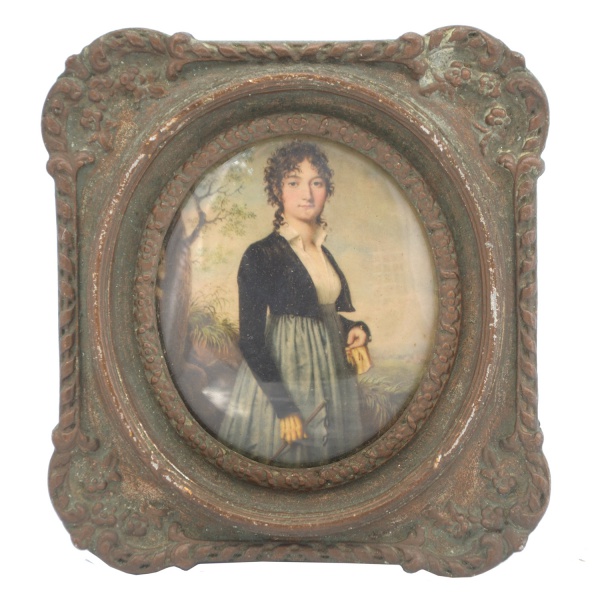 • Miniatura policromada de formato oval, representando mulher de pé em paisagem campestre. Moldura com frisos retos e quinas arqueadas. Leves defeitos na moldura. 11 x 9 cm (MI). 18 x 16 cm (ME).