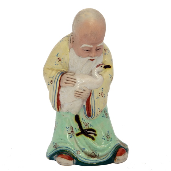 • Estatueta em porcelana chinesa policromada representando Shou Xing, o Deus da Longevidade, segurando a garça Gru, símbolo de longa vida. Base recortada. 12 x 7 x 5 cm.