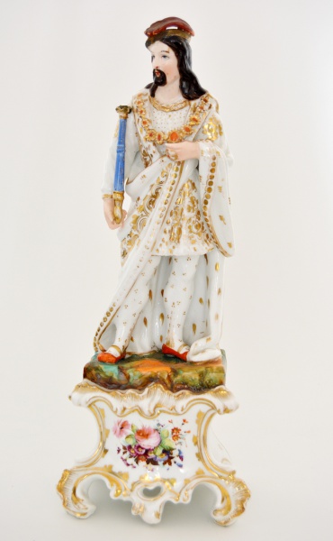 • FRANÇA. Séc XIX - Escultura em porcelana "Vieux Paris", representando a figura do Duque de Mantra. Base recortada e fenestrada, ornamentada por representações pictóricas florais.  31,5 cm.