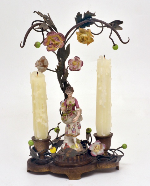 • Candelabro da manufatura italiana concebido em metal forjado em representação de árvore, guarnecido de apliques de flores e figura de camponesa em porcelana policromada. Base recortada apoiando duas bobeches contrapostas ao centro. Itália. Meados do século XX. 25 x 15 cm.