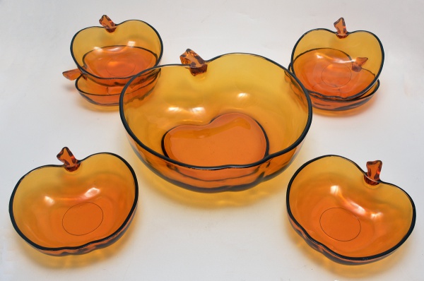 • Conjunto para salada de frutas em vidro italiano, moldado em formato de maçãs repartidas. Itália. Década de 1970. 9 x 28 x 26 cm (saladeira). 15 x 17 cm (menores).