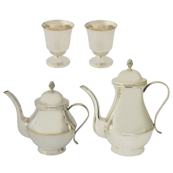 • Lote constando de 4 peças em metal prateado, sendo duas da manufatura nacional Wolff. A) Par de taças (10 x 7 cm). B) Conjunto de 2 bules sendo: 1 bule p/ café (22 x 21 x 12 cm) e um bule p/ chá (17 x 20 x 11 cm).