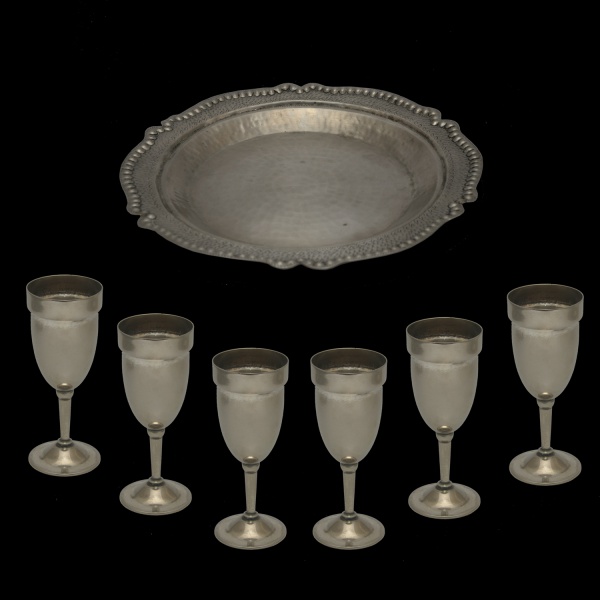 • Lote constando de 7 peças, sendo: 1 bandeja em metal prateado boliviano (29 cm) e conjunto de 6 taças em Pewter (16 cm).
