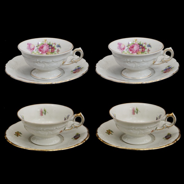 • Conjunto com 4 xícaras com seus pires em porcelana KPM apresentando decoração floral. No fundo marca da manufatura. 4 x 8 cm (xícara) 12 cm (pires).