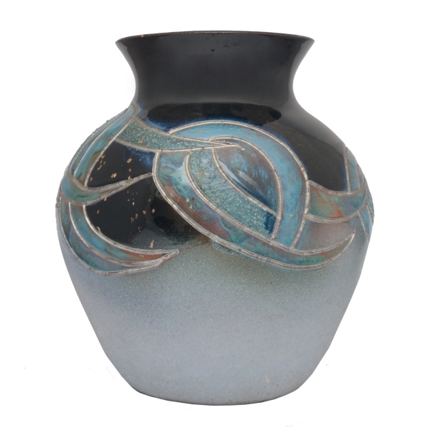 • Vaso bojudo e decorativo em cerâmica policromada frequentemente apresentando acabamentos vitrificados ou esmaltados. Exibe um degradê que vai de um azul profundo no topo até um tom esverdeado na base, decorado com motivos geométricos e orgânicos. 27 x 23 cm.
