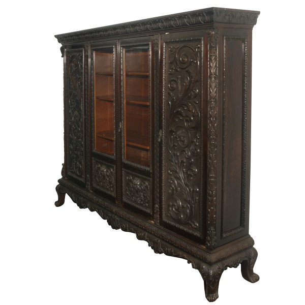 • Grande armário vitrine Book case, em madeira nobre, de formato retangular, profusamente esculpido e ornado com almofadas, frisos florais e painéis realçados por composições com ramos floridos. Frente apresentando 4 portas, sendo 2 laterais centralizando estante com parte superior envidraçada revelando prateleiras internas. Frontão saliente e reto, decorado por friso estilizado. Base com saia ondulada, apoiada sobre pés baixos e revirados em volutas. 191 x 234 x 48 cm. Este lote encontra-se na casa do comitente no Alto da Boa Vista, SP. A retirada deverá ser agendado previamente com o nosso escritório no telefone 11.5044.1228.