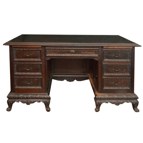 • Mesa de escritório em madeira nobre, de formato retangular, profusamente esculpida e ornada com almofadas, frisos florais e faixas estilizadas. Tampo liso com borda canelada e saliente, apoiada em caixa reta, apresentando gavetão ladeado por 3 gavetas superpostas. Verso com fundo fechado e saia recortada. Base reta e lavrada em arcos, apoiada em montantes ondulados rematados nas extremidades por pares de pés revirados em volutas. 82 x 154 x 80 cm. Este lote encontra-se na casa do comitente no Alto da Boa Vista, SP. A retirada deverá ser agendado previamente com o nosso escritório no telefone 11.5044.1228.