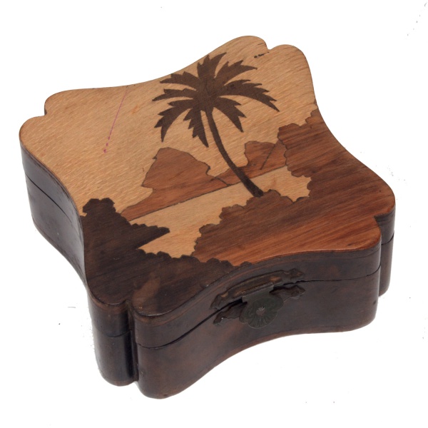 • Caixa porta joias em madeira artesanal. Tampo com marqueteire apresentando coqueiro, montanhas e mar. Estrutura de forma estilizado com fecho metálico. 4 x 10 x 10 cm.