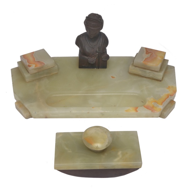 • Tinteiro de mesa em ônix, de formato retangular. Figura central em bronze, compartimentos para tinta e caneta. Acompanha mata borrão Um dos compartimentos de tinta precisa de ajustes. Está solto. 16 x 40 x 20 cm (MT). 9 x 15 x 7 cm (mata borrão). 13 x 8 cm (escultura de bronze).