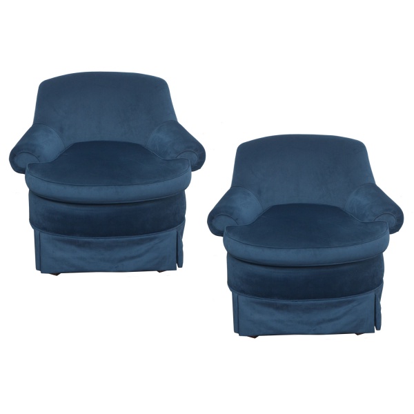 • Par de poltronas de linhas arredondadas com estrutura em madeira. Estofado em tecido (veludo) azul noite. 75 x 85 x 60 cm. Marcas de uso. Este lote encontra-se na casa do comitente no Alto da Boa Vista, SP. A retirada deverá ser agendado previamente com o nosso escritório no telefone 11.5044.1228.