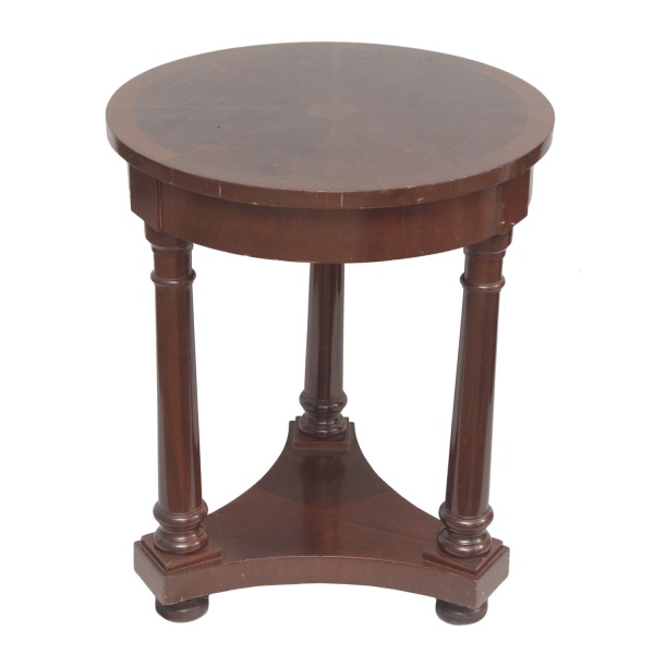 • Mesa lateral ou mesa de apoio em madeira nobre com características que remetem ao estilo Império. Tampo de formato circular com superficie plana, sustentado por três colunas e que se conectam a uma base sólida  Séc. XX. 58 x 48 cm.