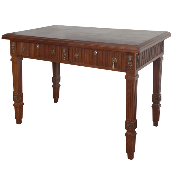 • Escrivaninha em madeira lustrada e tampo retangular apoiado em 2 gavetas ladeadas. Pernas robusta e torneadas. Gavetas com puxadores em metal. 76 x 108 x 61 cm. Falta pingentes.