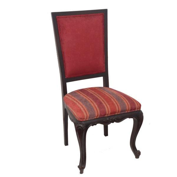 • Cadeira estilo inglês, com encosto reto estofado em tecido vermelho, apoiado em assento levemente abaulado e realçado por forração listrada em várias cores. Saia ondulada, ornada por adornos vegetais, apoiada em pernas dianteiras curvilíneas com joelhos salientes. Pés recurvos com volutas sobre sapatas. 102 x 50 x 45 cm.