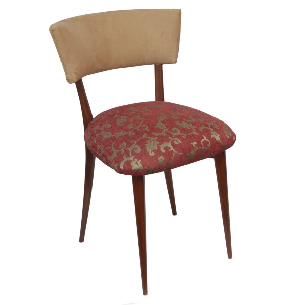 • Cadeira Retrô, com estrutura em madeira lisa levemente recurva. Encosto arqueado revestido com fazenda de cor bege. Assento quadrangular, com quinas arredondadas, forrado em tecido com estilizações florais douradas sobre fundo vinho. Pernas retas e lisas, levemente afinadas. Modelo conhecido como Pé de Palito. Década de 1950-1960. 80 x 45 x 37 cm.
