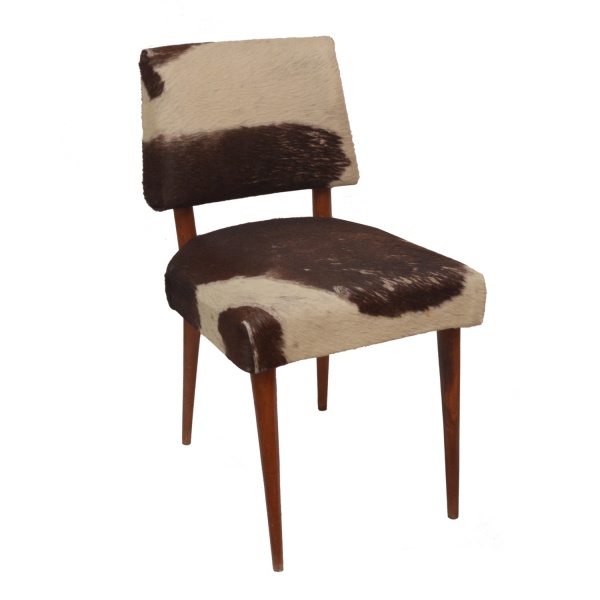 • Cadeira Retrô, com estrutura em madeira lisa levemente recurva. Encosto retangular e arqueado, apoiado em assento quadrangular. Forração em pele de boi malhada bege e marrom escuro. Pernas retas e lisas, levemente afinadas. Modelo conhecido como Pé de Palito. Década de 1950-1960. 70 x 44 x 42 cm.
