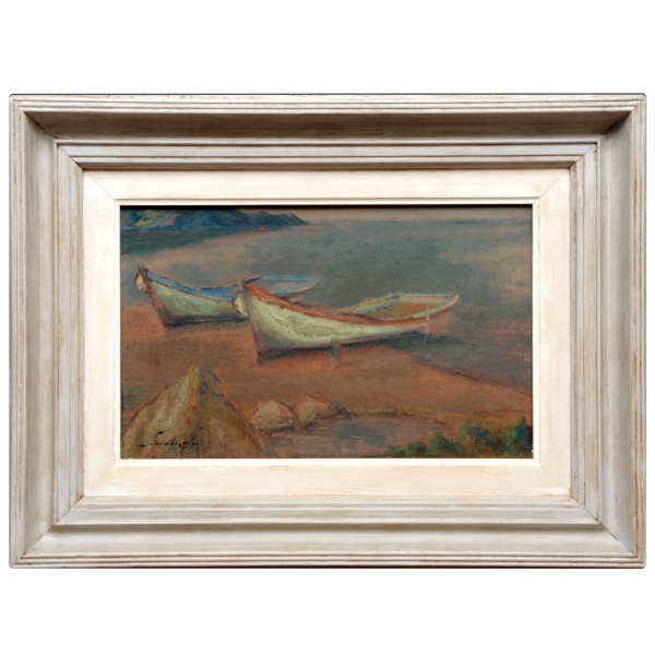 • JOSÉ SIMEONE (São Paulo, 1930 - 2009)  Paisagem Marítima com Barcos de Pesca. Óleo s/ Eucatex. Ass cie. 21 x 34 cm (MI). 40 x 53 cm (ME). Pintor ligado à arte figurativa,