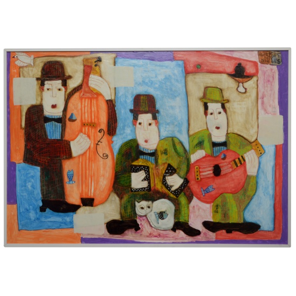 • ASFADUROFF NIBBES, JAVIER ALVARO (Montevidéu, Uruguai 1954)  Músicos. Óleo s/ tela. Ass. cid. 80 x 120 cm (MI). 83 x 123 cm (ME). Mais conhecido como Asfaduroff Nibbes ou apenas Nibbes, é um pintor uruguaio radicado no Brasil há mais de 30 anos. Nibbes é considerado mestre da encáustica, técnica que consiste no uso da cera como aglutinante dos pigmentos e pela mistura densa e cremosa. Colecionando mais de 10 mil obras pelo mundo, Nibbes é um pintor de alma celeste que atravessa fronteiras com suas obras coloridas numa busca do desequilíbrio de suas formas. Formas que fogem da simetria acadêmica, e que nos fazem mergulhar num universo único, particular, permeado de alegria.