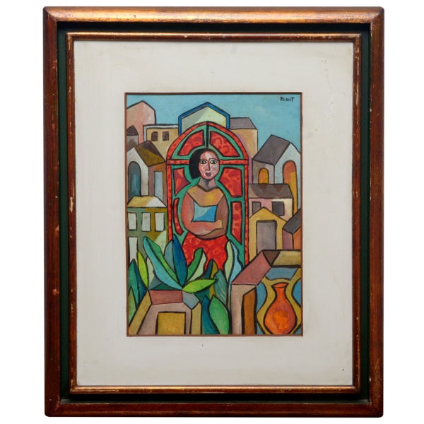 • RENOT (Reinaldo Eliomar de Freitas Marques da Silva - Santa Luzia, BA, 1932  SP, 2021) - Composição com Figura Feminina. Óleo s/ Eucatex. 32 x 23 cm (MI). 56 x 47 cm (ME). Pintor, tapeceiro e galerista baiano radicado em São Paulo. Seu estilo expressionista destacou-se por retratar casarios, fauna, flora e festas populares da Bahia, com cores vibrantes. Transferiu-se para São Paulo no fim dos anos 60, onde fundou sua própria galeria, promovendo artistas como Di Cavalcanti e Aldemir Martins.
