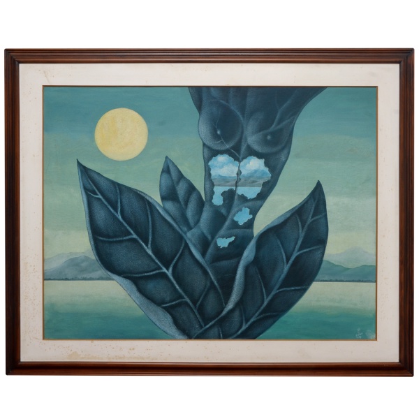 • WALTER LEWY (Bad Oldesloe, Alemanha 1905 - São Paulo, 1995)   Folha Negra. Óleo s/ tela. Ass. e datado 1987, cid. 70 x 93 cm (MI). 94 x 115 cm (ME). Apresenta manhas no passe-partout. Gravador, pintor ilustrador, paisagista, desenhista e publicitário. Walter Lewy é apontado como um dos principais nomes do surrealismo no Brasil,
