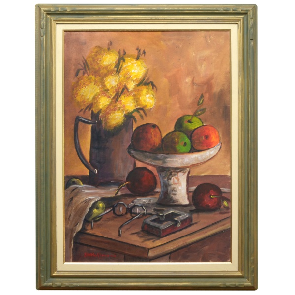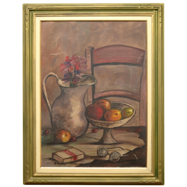 • B. K. HOFFMANN  Natureza Morta com Cadeira, Jarra e Cesto com Frutos. Óleo s/ tela. Ass. cie. 70 x 50 cm (MI). 88 x 68 cm (ME).