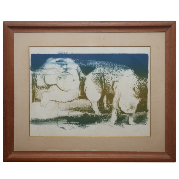 • HELENOS (Edson Heleno da Silva  Recife, 1941)  Representação Estilizada de um Homem e um Gato. Litografia. Ass. e datado 1971, cid. 45 x 60 cm (MI). 72 x 87 cm (ME). Pintor, ilustrador e publicitário, com obra figurativa e romântica, muitas vezes retratando o cotidiano de Recife.